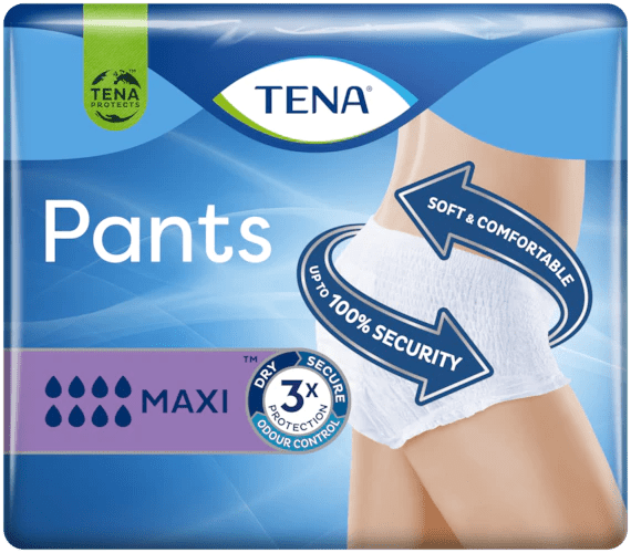 TENA Pants Maxi are white, soft, comfortable, disposable incontinence briefs for men and women, with a similar fit to regular underwear. With a body-hugging fit and breathable fabric-like materials, they're designed for soft comfort. Unlike conventional adult diapers, TENA Pants Maxi have a super-absorbent core that quickly and efficiently draws liquid away from the skin and provides 100% safety. When worn, the thin, flexible core forms the shape of two wicking channels, also known as a dual wicking zone, which efficiently channel moisture away from the body for optimal dryness and protection. Integrated escape barriers provide additional security. Reliable loss protection for an active and confident lifestyle, whatever the situation.Size M (hip: 80 to 110 cm) Absorption capacity: 8/8 (maxi) 10 units